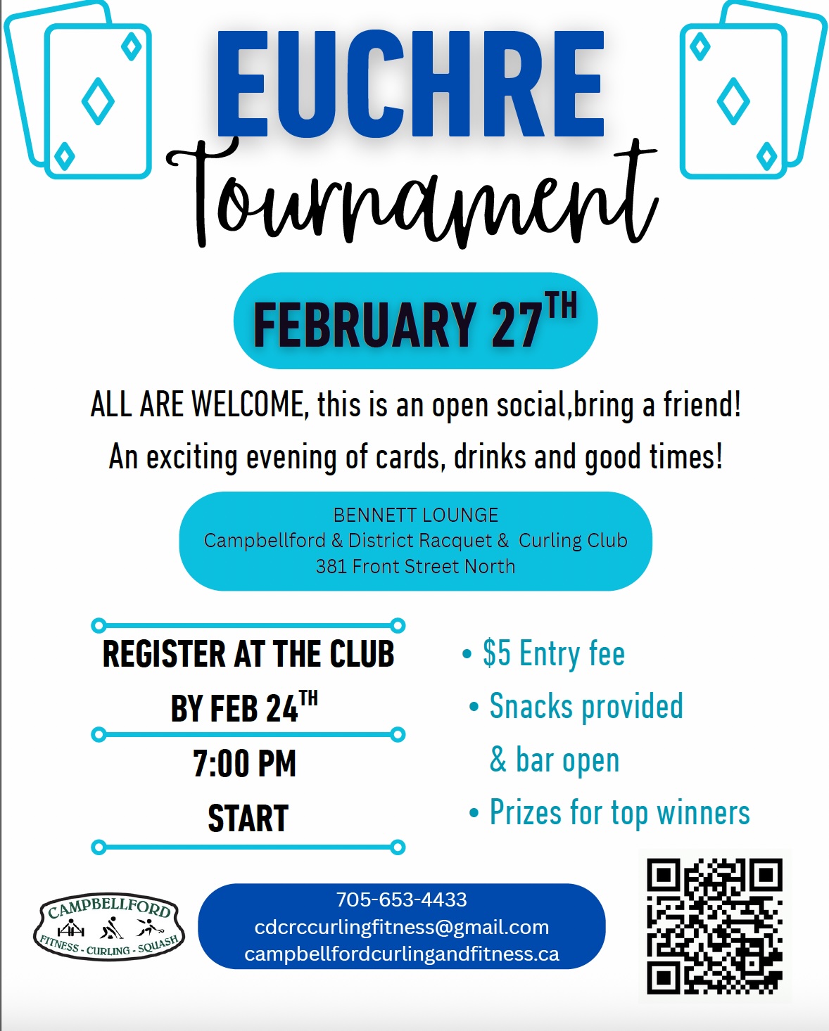 Euchre Tournament Feb. 27th. Open social event! Exciting evening of cards, drinks and good times. Details here.